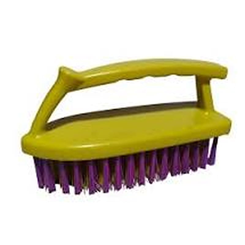 El cepillo de mano tipo plancha es una herramienta ergonómica esencial para el restregado que destaca por su asa superior cerrada que permite un agarre firme y protege los nudillos, sus cerdas de nylon rígidas diseñadas para remover suciedad incrustada en textiles o superficies duras y su forma en punta que facilita el acceso a rincones o esquinas difíciles.